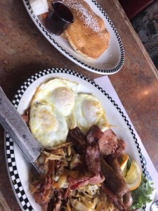They start by giving you 2 ginormous pancakes, 3 eggs cooked to your hearts desire, bacon, ham, AND sausage!! If those aren’t enough to satisfy your pallet, they also give you a hearty serving of hash browns. My favorite part about this meal is, the cost won’t break the bank.
