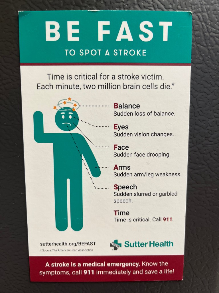 BE FAST is a catchy acronym that helps us remember the signs of stroke. I have this refrigerator magnet at home to help remind everyone just in case something were to happen.